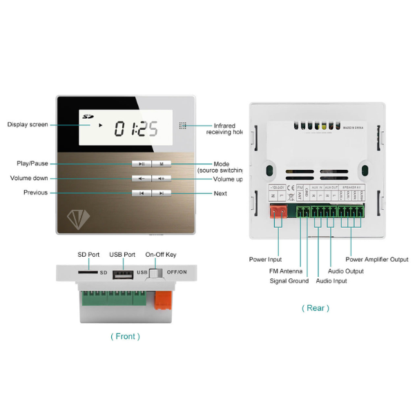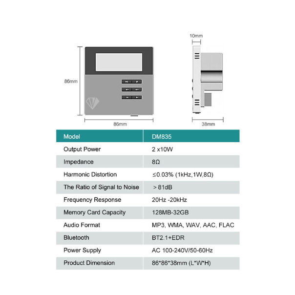 Amplificador de Parede Multifuncional c/ Touch Screen DMD 2 x 10W. Com 1 entrada AUX, Bluetooth, USB, Rádio FM e Controle Remoto.
